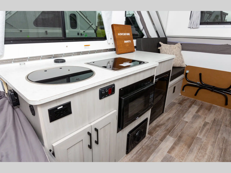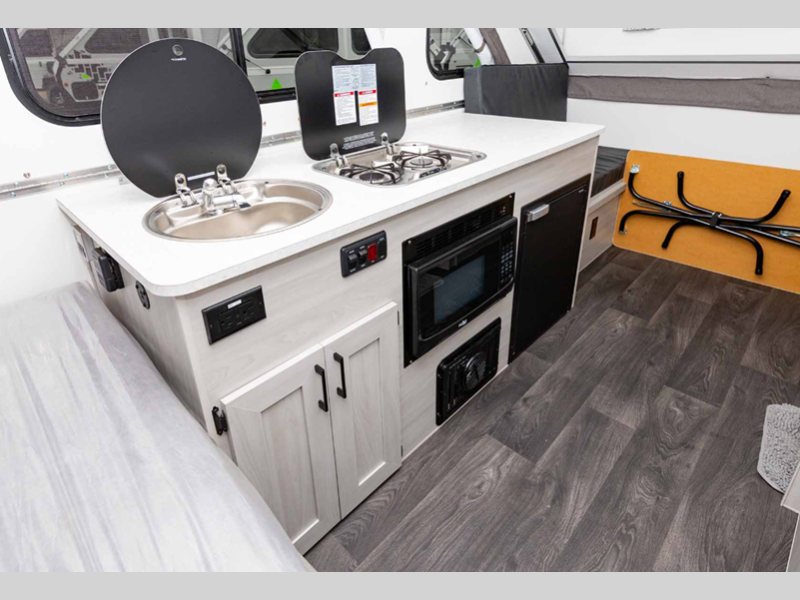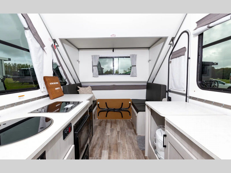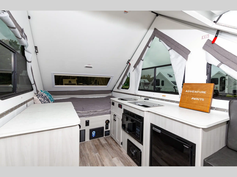 Each is built lightweight with an Azdel composite roof/sidewalls, and includes aluminum wheels, a Dexter rubber torsion axle, and a gray exterior fiberglass. There are also 14" tires, four stabilizer jacks, plus high wind lift assist. The interior offers 30% more storage room, more living space, taller counter tops, a taller bed, and the highest capacity chassis in the Aliner brand.