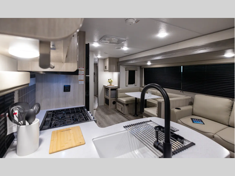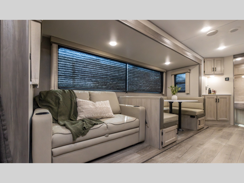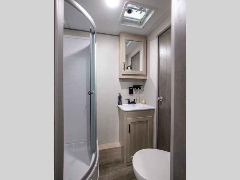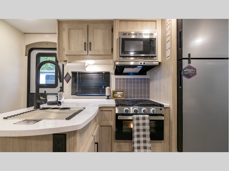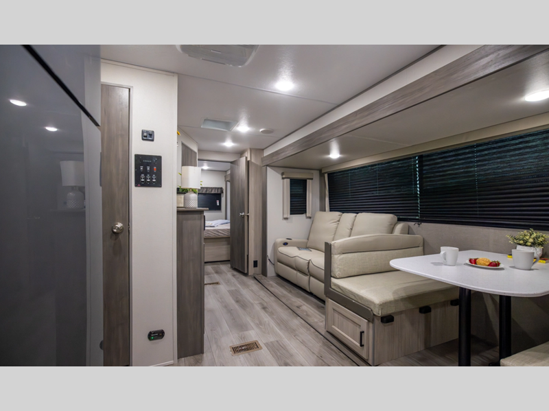 Sleeps 4 Slides 1 Length 28 ft 3 in Ext Width 8 ft Ext Height 11 ft 1 in Int Height 6 ft 9 in Hitch Weight 898 lbs GVWR 7898 lbs Dry Weight 6356 lbs Cargo Capacity 1542 lbs Fresh Water Capacity 38 gals Grey Water Capacity 44 gals Black Water Capacity 29 gals Furnace BTU 35000 btu Available Beds RV Queen Refrigerator Type GE Stainless 12V Refrigerator Size 10.7 cu ft Cooktop Burners 3 Shower Size 34" x 34" Number of Awnings 1 LP Tank Capacity 20 lbs Water Heater Type Tankless On Demand AC BTU 13500 btu Awning Info 18' Electric w/Multicolor LED Strip & Remote Axle Count 2 Number of LP Tanks 2 Shower Type Radius Electrical Service 30 amp Similar Floorplans
