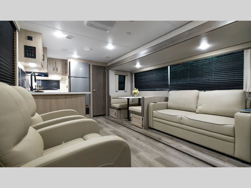 Sleeps 5 Slides 1 Length 33 ft 2 in Ext Width 8 ft Ext Height 11 ft 1 in Int Height 6 ft 9 in Hitch Weight 962 lbs GVWR 8736 lbs Dry Weight 7236 lbs Cargo Capacity 1500 lbs Fresh Water Capacity 38 gals Grey Water Capacity 74 gals Black Water Capacity 28 gals Furnace BTU 30000 btu Available Beds Queen Refrigerator Type GE Stainless 12V Refrigerator Size 10.7 cu ft Cooktop Burners 3 Shower Size 36" x 30" Number of Awnings 1 LP Tank Capacity 20 lbs Water Heater Type Tankless On Demand AC BTU 13500 btu Awning Info 21' Electric w/Multicolor LED Strip & Remote Axle Count 2 Number of LP Tanks 2 Shower Type Standard Electrical Service 30 amp Similar Floorplans