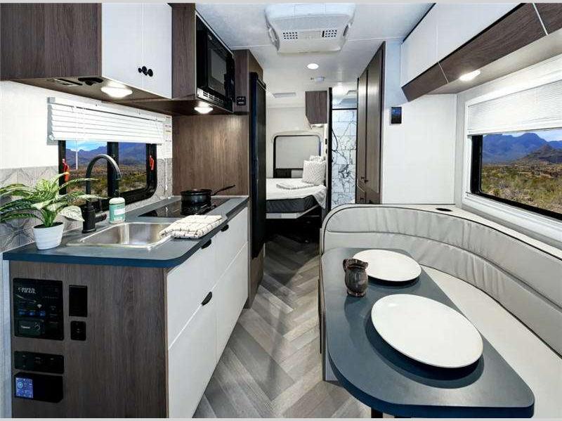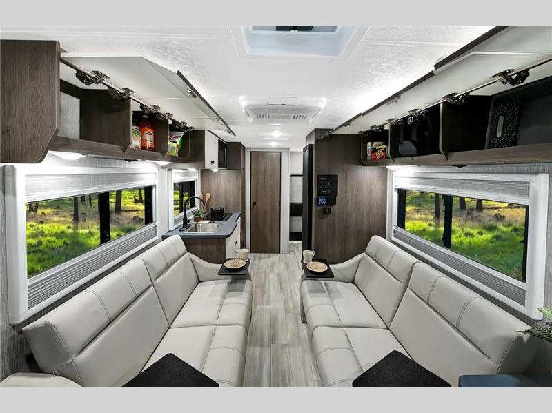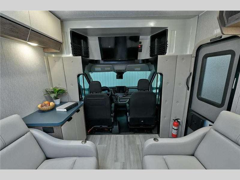 Each is built on a Ford Transit chassis with a 3.5L EcoBoost engine, and includes a lane-keeping system that is adjustable to activate either alert mode, assist mode or both, pre-collision assist with automatic emergency braking, and available All Wheel drive. Also included is the Ford AdvanceTrac with roll stability control that provides enhanced side-slip control and electronic rollover stability for the vehicle. The interior offers extra large kitchen counters and a three-way refrigerator, an interior/exterior Smart TV, and more!