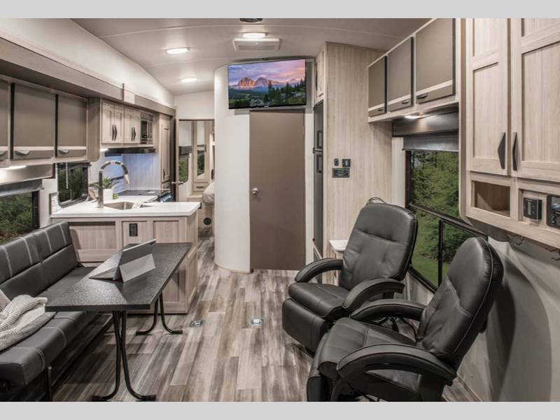 Sleeps 6 Slides 1 Length 37 ft 9 in Ext Width 8 ft 6 in Ext Height 13 ft 2 in Hitch Weight 1505 lbs GVWR 12800 lbs Dry Weight 9979 lbs Cargo Capacity 2773 lbs Fresh Water Capacity 98 gals Grey Water Capacity 57 gals Black Water Capacity 57 gals Tire Size 16" Furnace BTU 35000 btu Fuel Capacity 30 gals Number Of Bunks 1 Available Beds King Refrigerator Type 12V Refrigerator Size 10.7 cu ft Cooktop Burners 3 Number of Awnings 1 Axle Weight 6000 lbs Garage Size 12 ft 11 in LP Tank Capacity 30 lbs Water Heater Capacity 10 gal Water Heater Type LP/110/DSI AC BTU 15000 btu Awning Info 19' Power with LED Lights Axle Count 2 Number of LP Tanks 2 Shower Type Standard Electrical Service 30 amp Similar Floorplans