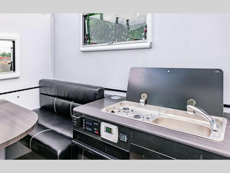 Inside, you'll find aluminum cabinetry, a kitchen area with a two-burner range/sink, and sleeping space for two in the camper or four in the trailer. A variety of options and color choices are available so you can customize to your personal liking. A standard furnace means you will be able to camp in colder temperatures, and you can use the exterior shower to keep things tidy inside.