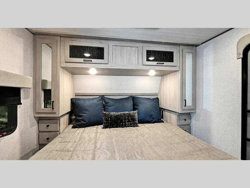 Sleeps 6 Slides 2 Length 33 ft 1 in Ext Width 8 ft 5 in Ext Height 12 ft 5 in Int Height 8 ft Hitch Weight 1350 lbs Dry Weight 8633 lbs Cargo Capacity 4717 lbs Fresh Water Capacity 110 gals Grey Water Capacity 60 gals Black Water Capacity 30 gals Furnace BTU 35000 btu Fuel Capacity 30 gals Number Of Bunks 1 Available Beds King Refrigerator Type 12V Black Glass Refrigerator Size 10.7 cu ft Cooktop Burners 3 Number of Awnings 1 Garage Size 14 ft Water Heater Type On Demand Tankless AC BTU 30000 btu Awning Info 19' Power with LED Lights & Auto Dump Axle Count 2 Shower Type Standard Electrical Service 50 amp Solar Wattage 400 watts Similar Floorplans