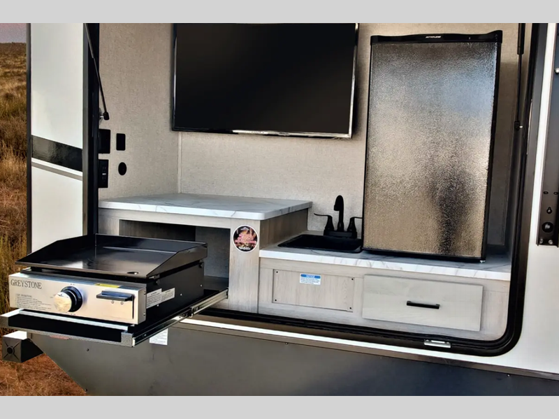 You can make yourself at home with solid pressed membrane countertops, interior LED lights, and black roller shades for added privacy. The outside shower with hot and cold water will let you easily wash off camp gear, and the marine grade exterior speakers will allow you to be the life of the campground. You will also appreciate the universal docking station for easy access to your hookups, plus a high-output on-demand tankless water heater for hot water when you need it.