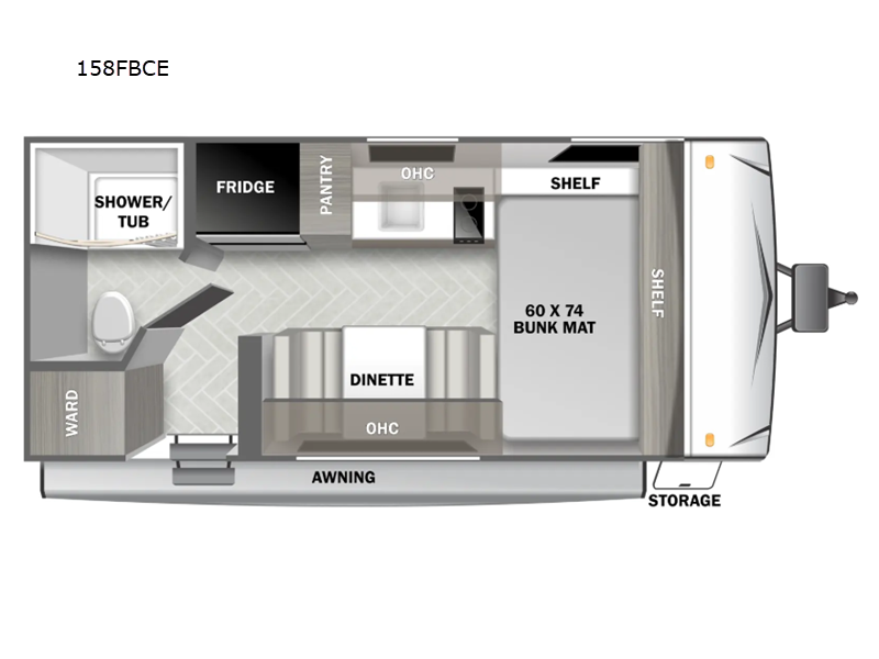 Camping trips are easier than ever in this cozy travel trailer for three. There is a 60" x 74" bunk mat up front with a storage shelf above and at the head of the bed for your things. The booth dinette will provide a place to dine together after you've made dinner on the two burner cooktop, and an additional guest or two little ones can sleep here at night. The private bath includes a shower/tub and a toilet so you don't have to use the camp's facilities at night, and you'll appreciate the entryway wardrobe to keep items organized.