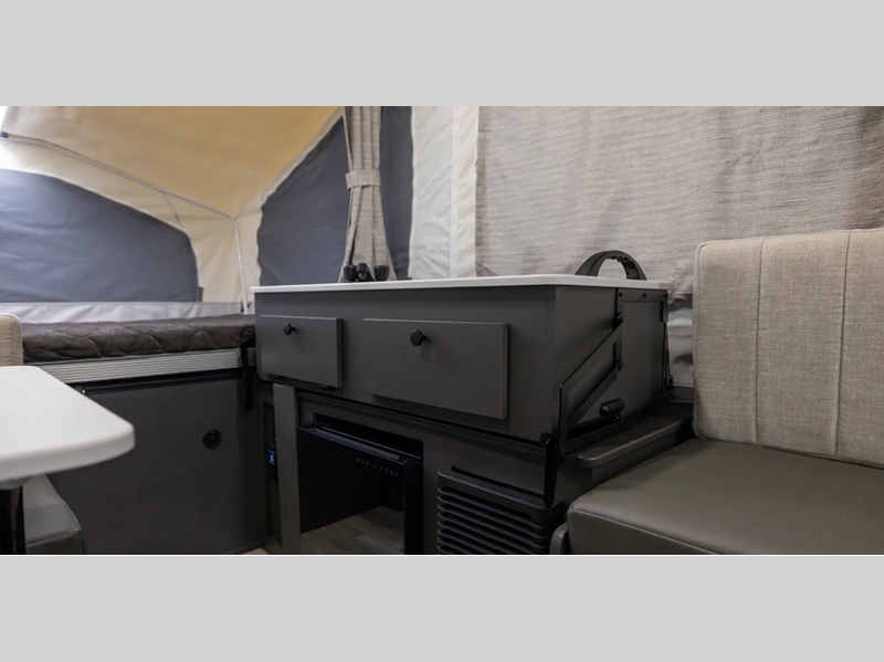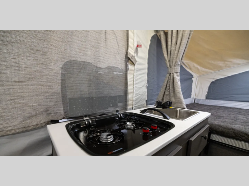 Sleeps 6 Slides 1 Length 16 ft 10 in Ext Width 7 ft Ext Height 5 ft Hitch Weight 260 lbs Dry Weight 2523 lbs Cargo Capacity 737 lbs Furnace BTU 20000 btu Available Beds Queen and King Tent End Beds Refrigerator Type 12V Cooktop Burners 3 LP Tank Capacity 20 lbs AC BTU 15000 btu Axle Count 1 Number of LP Tanks 2 Shower Type Wet/Bath Shower Electrical Service 30 amp Open Length 23 ft 11 in -