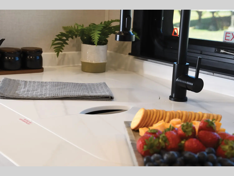 You will truly appreciate the stackable washer/dryer because it will allow you to travel without restraint, and the Truma Aqua Go Comfort on-demand hot water heater will give you hot water whenever you need it. You'll stay entertained with a Samsung LED Smart TV in the living room and a 40" LED TV in the bedroom, and the 200W solar panel will provide some off-grid capabilities.