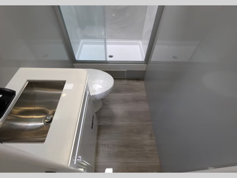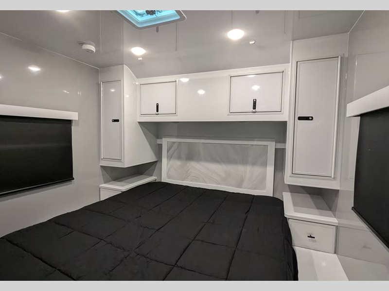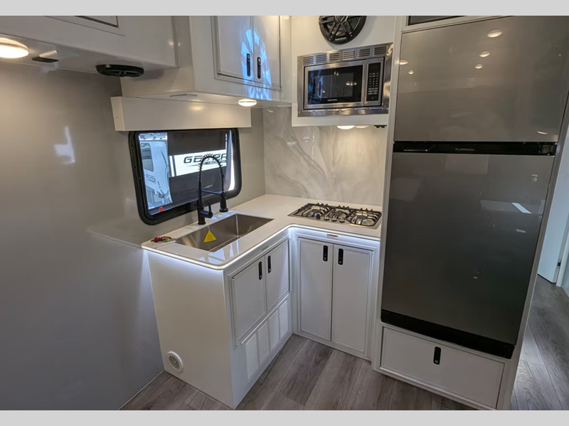 You will find premium materials throughout the FS RACE, including aluminum-welded cabinetry, fiberglass composite cabinet faces, plus seamless, aluminum framed fiberglass walls that are lightweight and durable. The front sleeper/front bedroom gives you your own space each night, while your guests take the drop-down queen bed and power dinette in the garage area!