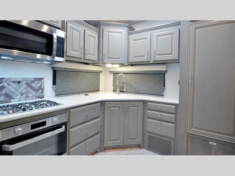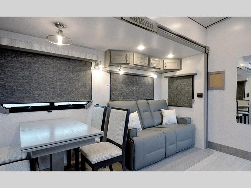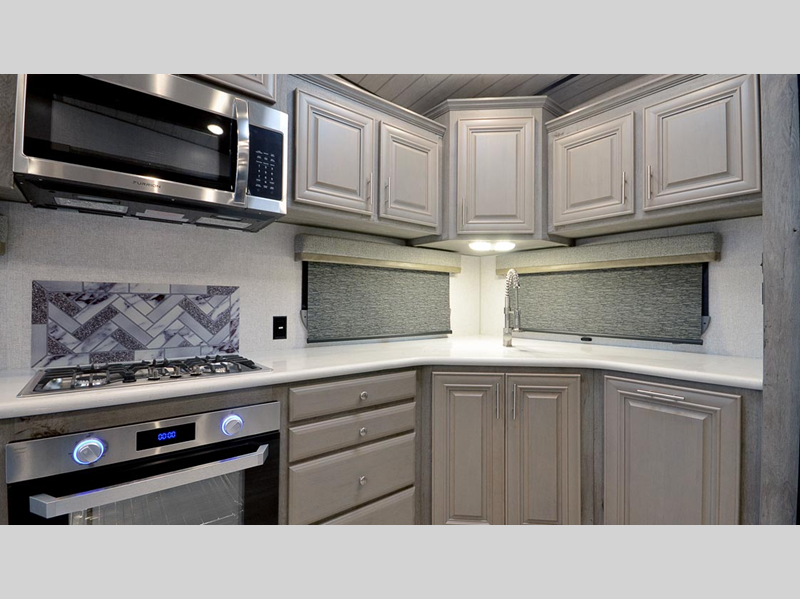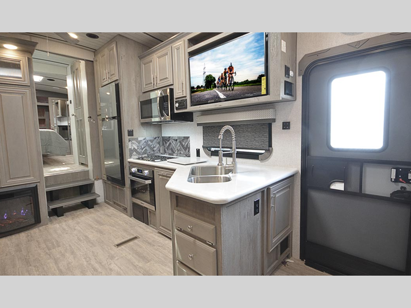 Sleeps 4 Slides 2 Length 34 ft 7 in Ext Width 8 ft 6 in Ext Height 13 ft 4 in Interior Color Moonstone, Carbon Hitch Weight 2640 lbs GVWR 15800 lbs Dry Weight 12870 lbs Cargo Capacity 2930 lbs Fresh Water Capacity 88 gals Grey Water Capacity 67 gals Black Water Capacity 65 gals Tire Size ST235/85R16 Furnace BTU 35000 btu Available Beds King Refrigerator Type 12V Refrigerator Size 10 cu ft Convection Cooking Yes Cooktop Burners 3 Number of Awnings 1 Axle Weight 10230 lbs LP Tank Capacity 80 lbs. Water Heater Capacity 16 gal Water Heater Type Gas/Electric Quick Recovery AC BTU 13500 btu TV Info LR 40" LED Smart TV Awning Info 18' LED w/Adjustable Pitch & Weatherguard Axle Count 2 Shower Type Shower w/Seat Electrical Service 50 amp Solar Wattage 1000 watts Similar Floorplans
