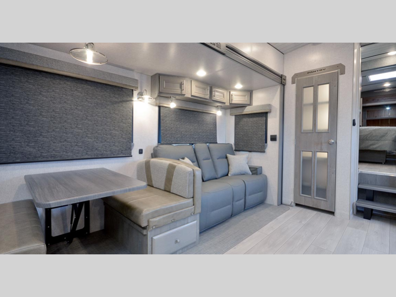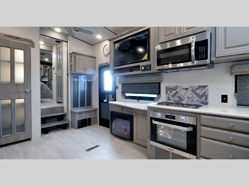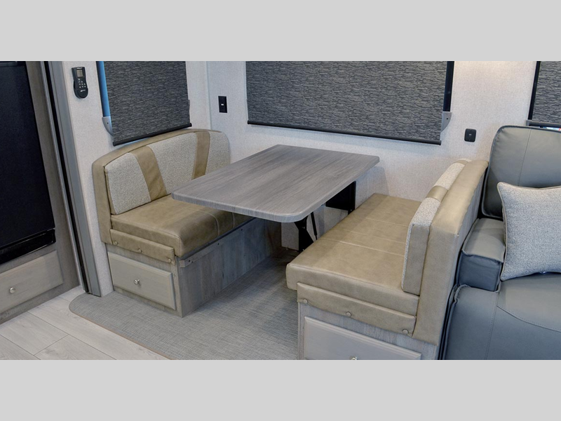 Sleeps 4 Slides 2 Length 29 ft 9 in Ext Width 8 ft 6 in Ext Height 13 ft 5 in Interior Color Moonstone, Carbon Fresh Water Capacity 88 gals Grey Water Capacity 102 gals Black Water Capacity 65 gals Tire Size ST235/85R16 Furnace BTU 35000 btu Available Beds Queen Refrigerator Type 12V Refrigerator Size 10 cu ft Convection Cooking Yes Cooktop Burners 3 Number of Awnings 1 LP Tank Capacity 80 lbs. Water Heater Capacity 16 gal Water Heater Type Gas/Electric Quick Recovery AC BTU 13500 btu TV Info LR 40" LED Smart TV Awning Info 18' LED w/Adjustable Pitch & Weatherguard Axle Count 2 Shower Type Shower w/Seat Electrical Service 50 amp Solar Wattage 1000 watts Similar Floorplans