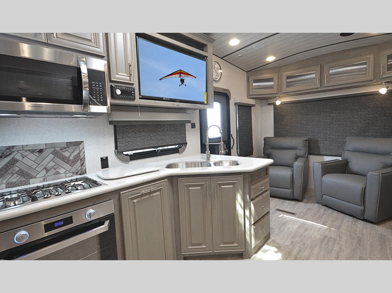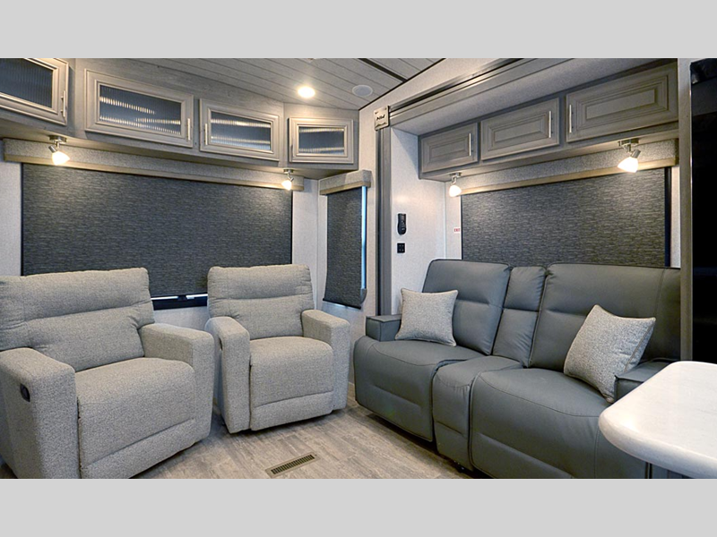 Sleeps 4 Slides 3 Length 36 ft 10 in Ext Width 8 ft 6 in Ext Height 13 ft 5 in Interior Color Moonstone, Carbon Hitch Weight 3110 lbs GVWR 16300 lbs Dry Weight 13965 lbs Cargo Capacity 2335 lbs Fresh Water Capacity 82 gals Grey Water Capacity 67 gals Black Water Capacity 65 gals Tire Size ST235/85R16 Furnace BTU 35000 btu Available Beds King Refrigerator Type 12V Refrigerator Size 16 cu ft Convection Cooking Yes Cooktop Burners 2 Number of Awnings 1 Axle Weight 10855 lbs LP Tank Capacity 80 lbs. Water Heater Capacity 16 gal Water Heater Type Gas/Electric Quick Recovery AC BTU 15000 btu TV Info LR 40" LED Smart TV Awning Info 14' 6" LED w/Adjustable Pitch & Weatherguard Axle Count 2 Shower Type Shower w/Seat Electrical Service 50 amp Solar Wattage 1000 watts Similar Floorplans