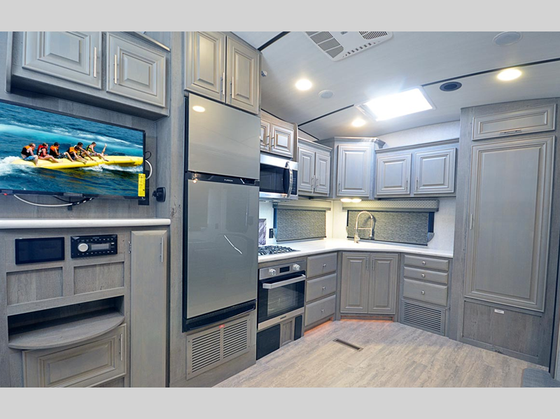 Sleeps 4 Slides 3 Length 36 ft 10 in Ext Width 8 ft 6 in Ext Height 13 ft 5 in Interior Color Carbon, Moonstone Hitch Weight 2928 lbs GVWR 16300 lbs Dry Weight 13491 lbs Cargo Capacity 2809 lbs Fresh Water Capacity 88 gals Grey Water Capacity 67 gals Black Water Capacity 65 gals Tire Size LT235/85R16G Furnace BTU 35000 btu Available Beds King Convection Cooking Yes Cooktop Burners 3 Number of Awnings 1 Axle Weight 10563 lbs LP Tank Capacity 80 lbs Water Heater Capacity 16 gal Water Heater Type DSI Gas/Electric with Quick Recovery AC BTU 15000 btu TV Info LR 40" LED Smart TV Awning Info 14' 6" 12V LED w/Adjustable Pitch Axle Count 2 Washer/Dryer Available Yes Shower Type Shower w/Seat Similar Floorplans