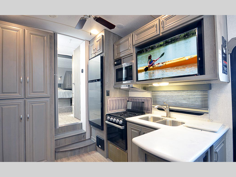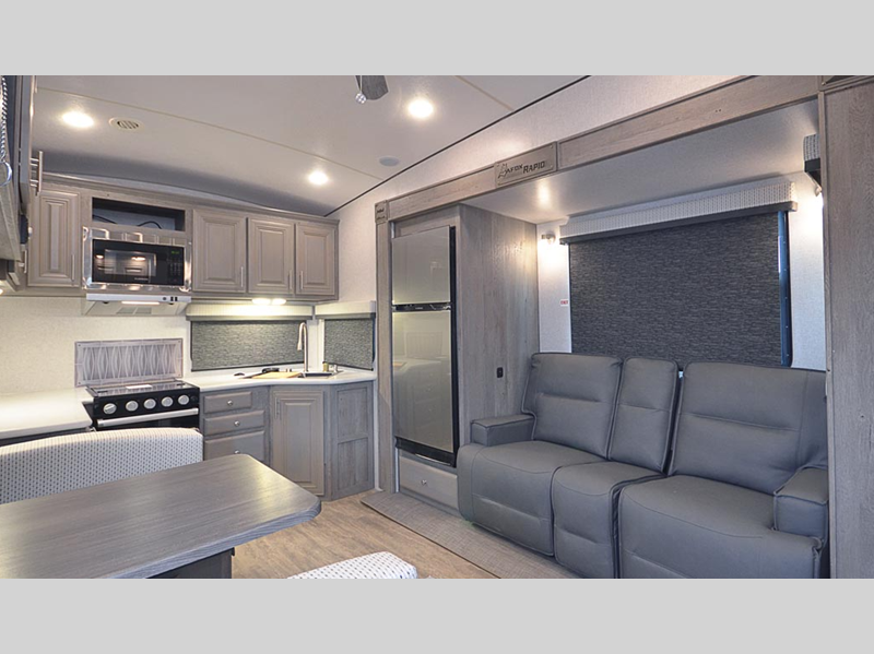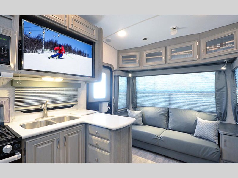 Sleeps 3 Slides 2 Length 29 ft 2 in Ext Width 8 ft Ext Height 12 ft 10 in Interior Color Carbon, Moonstone Hitch Weight 2440 lbs GVWR 12000 lbs Dry Weight 9630 lbs Cargo Capacity 2370 lbs Fresh Water Capacity 82 gals Grey Water Capacity 75 gals Black Water Capacity 35 gals Tire Size ST235/80R16 Furnace BTU 30000 btu Available Beds Queen Refrigerator Type 12V Refrigerator Size 10 cu ft Cooktop Burners 3 Number of Awnings 1 Axle Weight 7190 lbs LP Tank Capacity 30 lbs Water Heater Capacity 10 gal Water Heater Type DSI Gas/Electric Quick Recovery AC BTU 13500 btu TV Info LR 40" 12V LED TV Awning Info 14' 12V LED w/Adjustable Pitch Number of LP Tanks 2 Shower Type Shower w/Seat Solar Wattage 400 watts Similar Floorplans