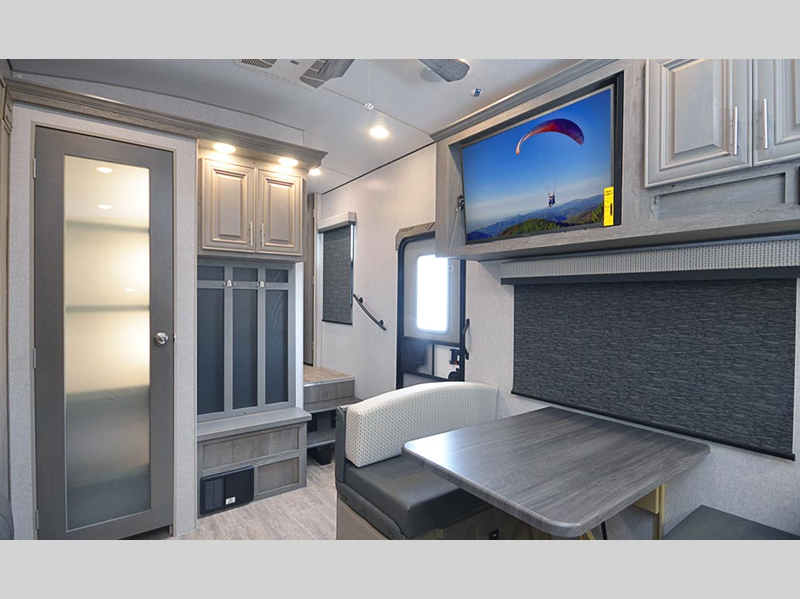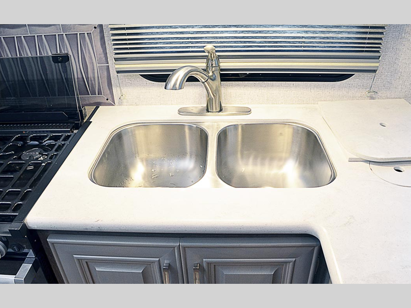 The durable construction materials continue on with a fully welded, thick-wall aluminum frame, corona treated fiberglass, and an aerodynamic front fiberglass cap. The MORryde CRE-3000 suspension and MORryde RPB pin box will make towing easier than ever, and the exterior convenience center is rear view camera ready if you want to add that option. There are solid surface kitchen countertops inside, along with slow-rise night shades with magnetic catches, a glass shower enclosure, and many more comforts.