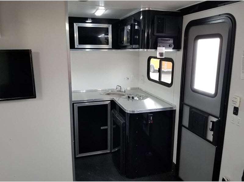 The rear ramp door will make unloading easier than ever, plus there is rubberized flooring and tie-downs to keep your toys secure during transport. You'll find a fully-equipped kitchen to prepare meals in each day, versatile sleeping arrangements, and full bath amenities to clean up after a day in the dirt. A 7' 6" interior height allows you to move about comfortably, and you'll find plenty of storage space for your valuables and riding gear.